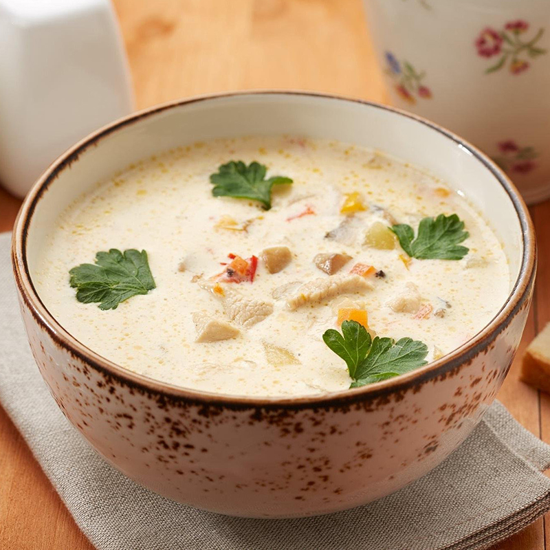 Если вы кушаете куриный крем-суп дома - добавьте отварное яйцо, грибы или сухарики для антуража!